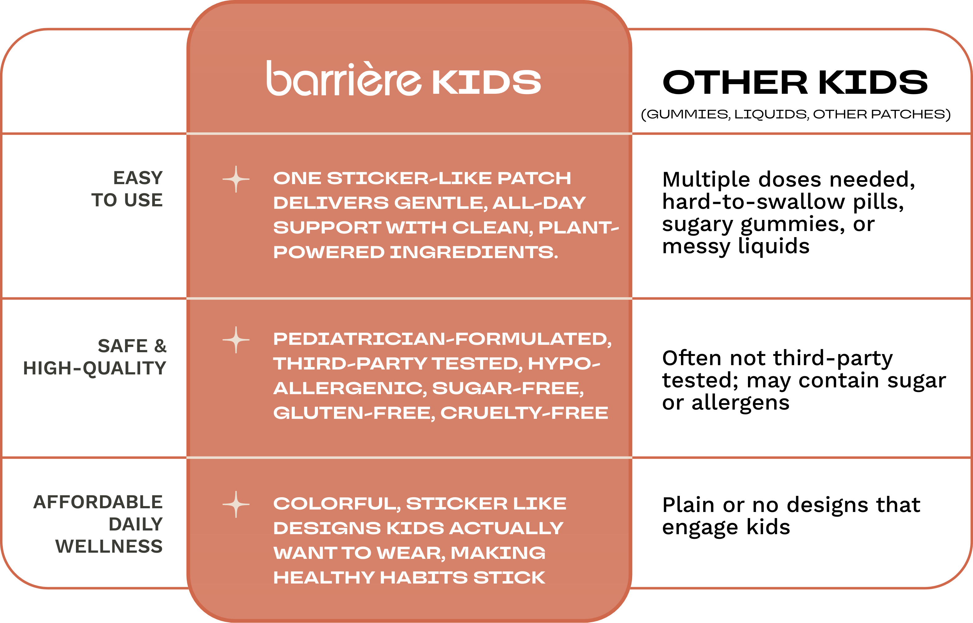 Our transdermal patches offer a vitamin alternative, designed for steady, consistent release of ingredients through the skin—making for a convenient, once-daily application. No sugar, artificial dyes or flavors. No choking hazard. Gentle on sensitive stomachs. And easier for kids who dislike the taste or texture of vitamins.